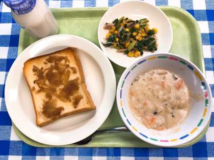 今日は体があたたかくなるメニューにしました。秋から冬にかけて赤く色づきおいしくなるりんごを甘く煮込み、トーストにしました。シナモンは、体をあたためてくれます。冬野菜のほうれん草や温かいスープをしっかり食べ、元気な体を作りましょう!