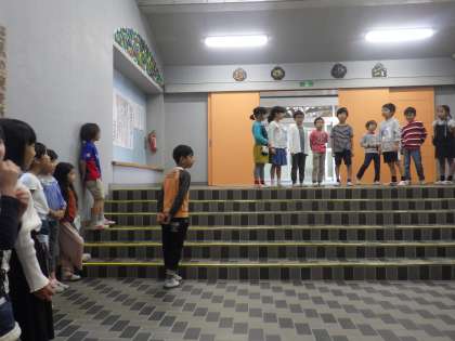 舞台の上で立ち位置を確認したり、舞台下のひな壇で動きを確認したり、他のグループの邪魔にならないように、体育館入り口の階段をステージに見立てて練習したりしました。