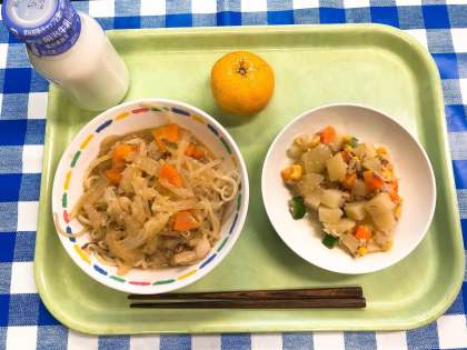 今日は、人気メニューのみそラーメンです。ラーメンは手軽に食べられておいしいので、日本人に愛されている料理です。一方、体に悪いというイメージを持っている人もいると思います。給食のラーメンは、野菜をたっぷりと入れており、塩分もひかえ目にしています。みなさんの成長に必要な栄養をとれるようにしっかり栄養士が考え、調理員さんが心をこめて作ってくれているので、安心して食べてください。