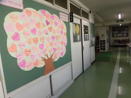 北校舎1階の学校主事・警備員室前の廊下掲示コーナーに紹介してあります。また、来週月曜日の全校朝会でも、みんなの協力ででき上ったことを報告・紹介する予定です。素敵な心温まる“ふわふわ言葉”を大切に、学校生活でも校外生活でも普段から使える子どもたちを育てていきます。