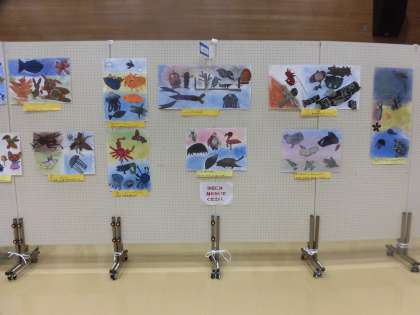 身近な材料を使って、デコボコの面白い模様の生き物たちを紙版画で表した作品です。今回は版を使って共同で作品づくりをしました。それぞれの班で話し合いながらでき上がった作品です。ぜひ、ご覧下さい。