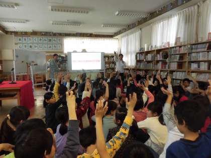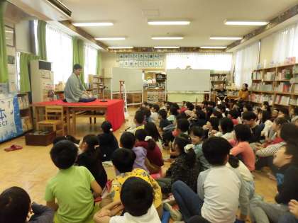今日の3校時に図書館で、3年生を対象とした「海の親子寄席」出前授業が行われました。
