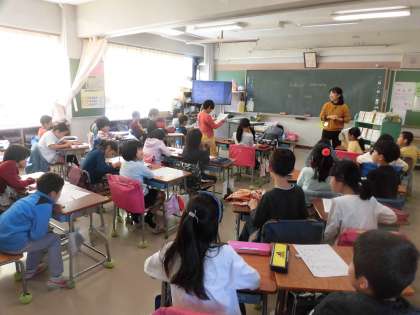 後半は、出前授業の担当者により、プラスチックごみやマイクロプラスチックの環境問題について授業を進めていただきました。映像やクイズを交えながら楽しく学習することができました。