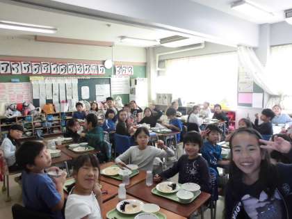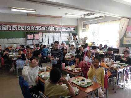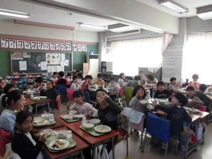今日は、3年生の「桃太郎」とコラボした給食です。ちょうど4時間目に学芸発表会の練習をしていた3年生は、「きびごはんだー!」などといながら、急いで教室にもどってきました。各学級を見て回ると、とてもうれしそうに食べており、ごぼうが苦手な子も、鬼の金棒のごぼうは頑張って食べている様子が見受けられました。