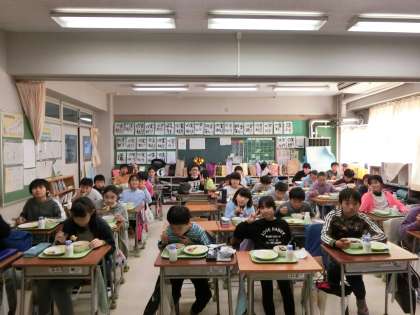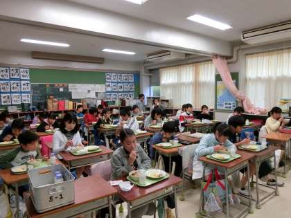 教室を見て回ると、精一杯演技をした子供たちは少し疲れていたようで、黙々と給食を食べていました。