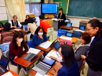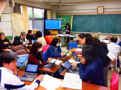 研修では、児童が作った作品を共有するシステムや発表の仕方等を学びました。タブレットを使うことで自然と協働学習になることを実感しました。