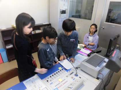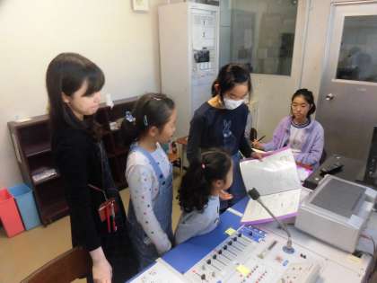 7つの班が順番に、放送室のマイクの前に移動し合図を受けてから、紹介原稿を分担して読み上げていました。「このようなお店を開きます。ぜひ、来てください!」のような紹介が、校内全体に流れました。