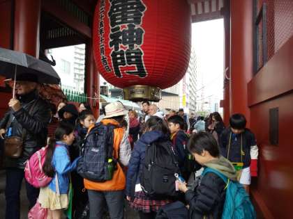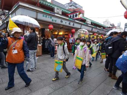観光客でにぎわう仲見世や雷門などを見学しました。ボランティアガイドさんの詳しい説明を聴きながら、メモもしながら、一生懸命です。