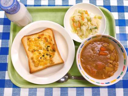 食べ物のおいしさは、味だけでなく、香りや食感、見た目からも感じることができます。給食では、なるべく見た目のいろどりがよいように、気をつけて献立をたてています。今日の給食は、きれいに3色がそろいました。マヨコーントーストの黄色、キャベツサラダの緑、ビーンズシチューの赤。まるで信号のようですね。