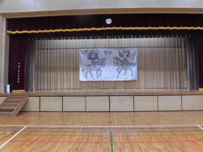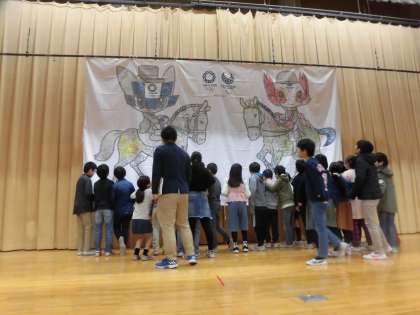 世田谷区オリンピック・パラリンピック担当課からの依頼を受け、世田谷区立小学校61校の3年生と4年生約12500人が7月に取り組んだ「オリンピック・パラリンピックのイメージ画」を、配色に配慮しながらつなぎ、組み合わせた“モザイクアート”の横断幕を区からお借りし、体育館ステージに展示しました。
