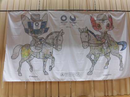 縦3m・横5mで、世田谷区のシンボルでもある馬事公苑の馬に乗った、東京オリンピック・パラリンピックのマスコットのミライトワとソメイティーが描かれています。