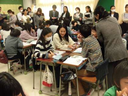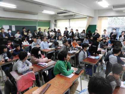 授業公開は5校時に、6年2組で行われました。主題は「理解し合うたいせつさ」で、内容は相互理解・寛容についてです。道徳の教科書から「『ダン』をどうするの?」を教材として扱い、子どもたちは、自分の考えをもち、グループや全体で議論し、考えを深めたり広げたりし合っていました。たくさんの参観者がいる中での学習でしたが、活発に学習していました。