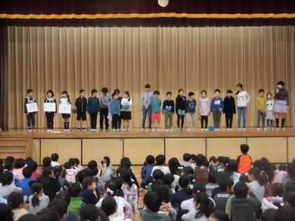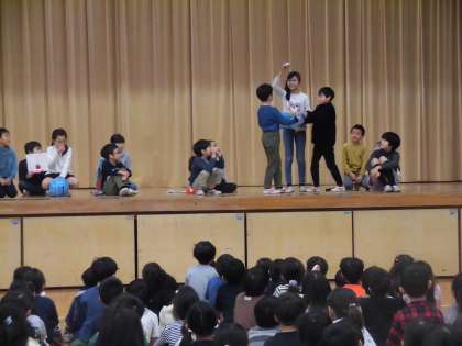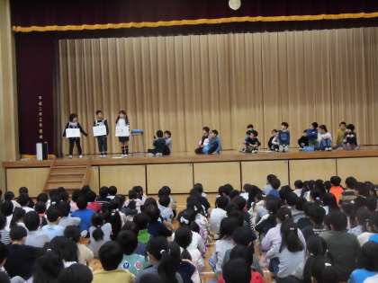今回は、笹の子班赤班の7つの班が、自分たちのお店の内容や遊び方などを、それぞれ工夫を凝らして紹介しました。どの班も、上級生と下級生が協力して、とても上手に紹介していました。一つ一つの班に、全員から大きな拍手が送られていました。