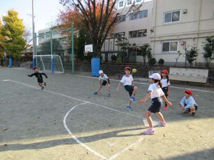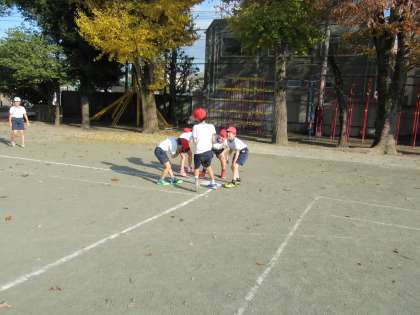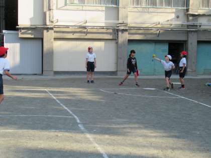 前回まで、手を使ってボールを打つ練習をしたり、チームごと作戦を立ててきたりしました。点数が入ったときのうれしそうなかん声や、「アウト!」という元気な声が校庭にひびきわたりました。