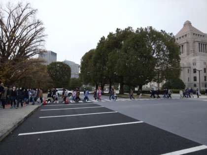赤いじゅうたんが敷き詰められた通路を進み、議場や御休所、中央広間の3人の銅像を見ました。都道府県の木が植えられている庭園も通りました。