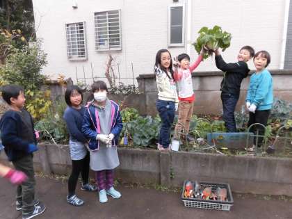 自分たちで育てて観察を続けてきた白菜の収穫には大きな感動を味わい、その隣で育つキャベツやカリフラワーの生長にも驚きを見せていました。