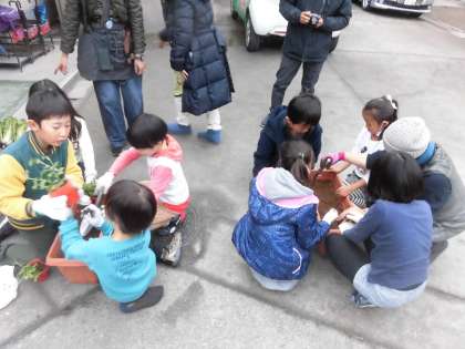 今日の活動は、(1)畑の雑草抜き (2)自分たちで種まきをした白菜の収穫 (3)スナップエンドウの苗植え (4)収穫をした白菜や河原農園さんからいただいた野菜などを入れた豚汁をみんなでいただこう でした。