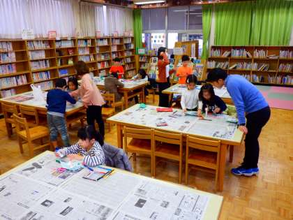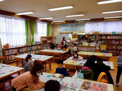 本日、図書館では、今年最後の図書館イベントが行われました。今回は「クリスマスカードを作ろう」です。子どもたちは、雪だるまやクリスマスツリーなど思い思いのクリスマスを表現していました。雪だるまの細かい表情を作っている子やお父さんへの感謝をきている子もいました。自分だけの作品になったことと思います。来年も図書館イベントが楽しみになりますね。