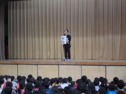 続いて、6年生の笹の子スピーチは、「水陸両用車」についてと「寄付」についてでした。もともと軍事利用のために開発された水陸両用車が、現在では観光や人命救助に使われていること、着なくなった服を捨てたりリサイクルに出したりするが、寄付することで他の国の子どもたちが助かったり、その国に仕事が生まれたりすることなど、日常気付きにくい視点からスピーチをしていました。