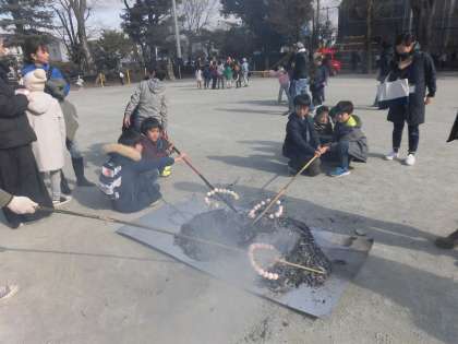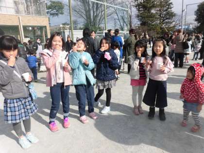 子どもたちが楽しみにしていた「お団子」です。保護者の方々のお手伝いを受けながら、数人ずつのグループで、協力してお団子を焼き、早速いただきました。「おいしい!」「もっと食べたい!」など、笑顔もいっぱいの子どもたちでした。