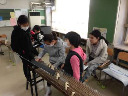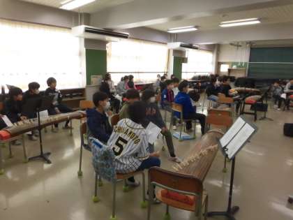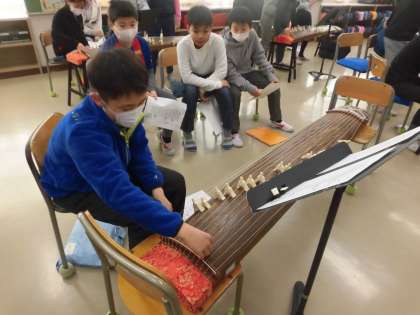 今日の音楽は、日本の楽器「こと」の演奏でした。楽ふの読み方を習って、「爪のない方に爪をつけてね。」の声かけで、さっそく爪をはめました。「さくら」の曲のはじめの3音が鳴らしたら、みんないっしゅん止まって、どの子の顔もほころんできました。「思ったより上手にできた。」「いい音がひびいた。」グループで交代しながら、演奏を楽しみました。