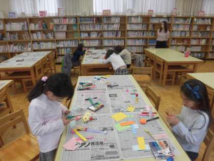 ネズミが出てくる本をしょうかいし、言葉遊びの本の読み聞かせをしました。それから、ネズミつりのおもちゃをみんなでたくさん作りました。いろいろな表情のネズミと動物たちができて、最後はつり合戦で盛り上がりました。