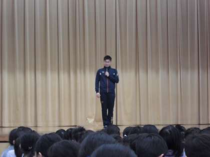今日の全校朝会の校長先生のお話しは、先週の24日から行われている「全国学校給食週間」についてから始まりました。終戦後の栄養が十分でない日本の子どもたちのために外国からの支援を受けて始まった学校給食について考える週間です。それにあわせて先週よりオリンピック・パラリンピックの開催地にちなんだ献立など、工夫された給食が提供されています。今週もどんな献立が出てくるか楽しみにしてください。