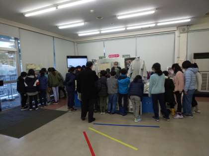 ゲストホールで概要説明を受け、熔接行程と組立行程を順に見学。人とロボットが役割分担をして、手際よく作業する様子や迫力ある行程を間近に見ることができました。また、働く人々が身に付けたり使ったりしている服装や工具に触れる体験もできました。