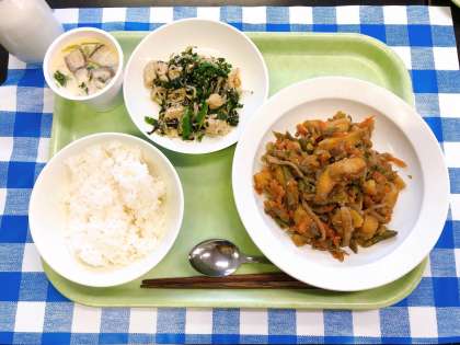 全国学校給食週間最終日の今日は、今年のオリンピック・パラリンピック開催国、日本の料理です。日本の料理は、「和食」といい、ユネスコ無形文化遺産にも登録されました。食べ物そのもの味をいかし、旬などの季節感を大切にするという特徴があります。また、魚や昆布など、自然のものからとる「だし」を料理に使ったり、食材を上手に保存した「乾物」を使ったりします。今日は、冬が旬のほうれん草と、乾物をたっぷり使ってあえものを作りました。だしのうまみをきかせた茶碗蒸しもぜひ味わって食べてください。