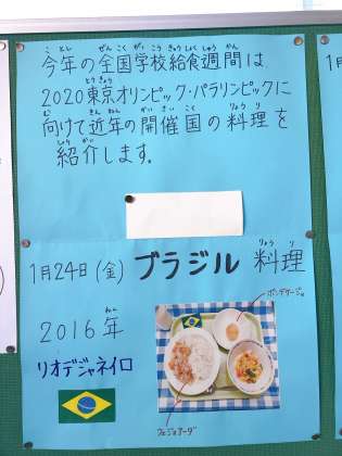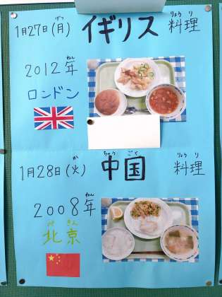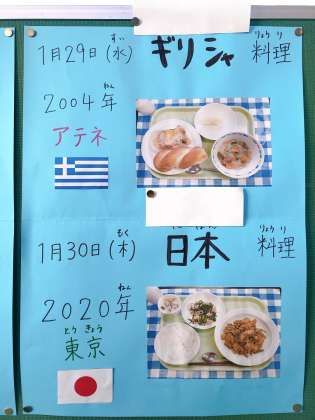 全国学校給食週間の5日間にわたり、2020東京オリンピック・パラリンピックにむけて、歴代の開催国の料理を紹介した給食を出しました。