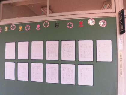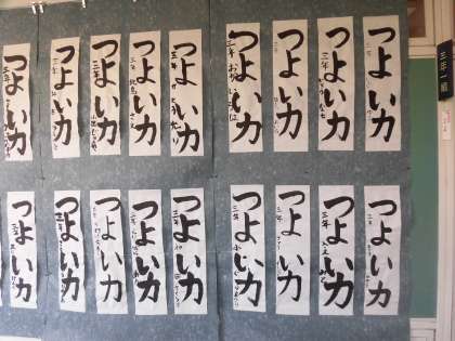 1年生と2年生は硬筆で、3年生以上は毛筆で、文字の形や筆の入れ方・運び方・止め方などを、お手本を参考にしながら、一人ひとりが丁寧に、また力強く書いた作品がそろいました。