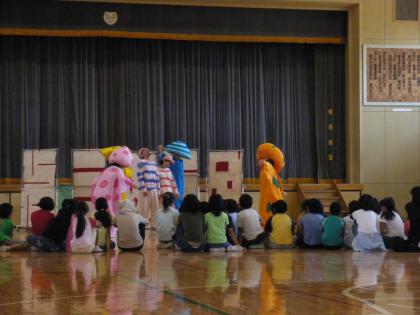 4・5年生の児童が、演劇を見るだけでなく、俳優の方と一緒に劇にも参加し、劇の最後をみんなで作り上げる体験をしました。この公演は、劇世界を体験しながら、子どもたちの想像力がかきたてられ、のびのびと表現するきっかけになってくれればという願いが込められています。教室に帰っても劇を思い出して「ビビビ…」と言っている児童の楽しそうな姿が見られました。