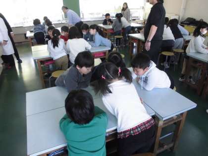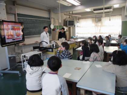 学級毎に家庭科室に集まり、教授からしょう油の材料や、使われている食品、味や香り、色等、様々なことを体験やクイズを通して教わりました。