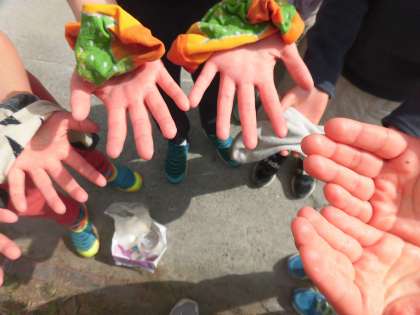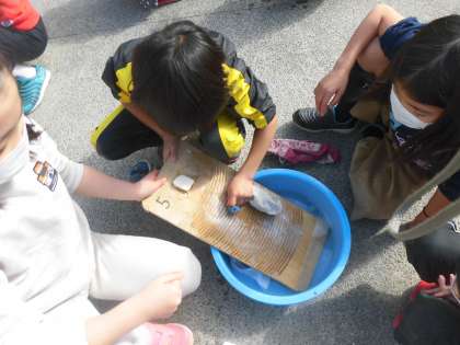 今日は3年1組が洗濯板を使って洗濯をする体験をしました。