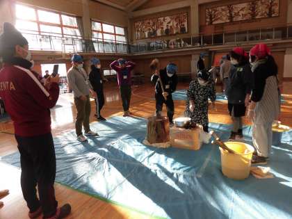 昨日も、PTAもちつき係のみなさんを中心に準備を進めていただき、今朝には、係のみなさんとおやじの会のみなさんに多数参加していただき、子どもたちのための「もちつき体験と試食」に向けて、準備をスムーズに進めてくださいました。