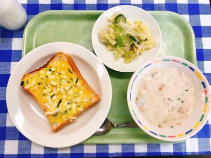 たまごトーストは、給食室でゆでたまごをつくり、ひとつひとつカラをむいてつぶしています。みなさんは、たまごのカラむきをしたことがありますか?カラは中身にくっついていて、なかなかきれいにむけません。また、たまごの白身と同じ白色なので、むき残しがないようにするのが大変です。今日は、全部で227個のたまごをゆでたまごにして、カラをむきました。朝早くから一生懸命がんばってくれた調理員さんに感謝して、味わって食べてください。