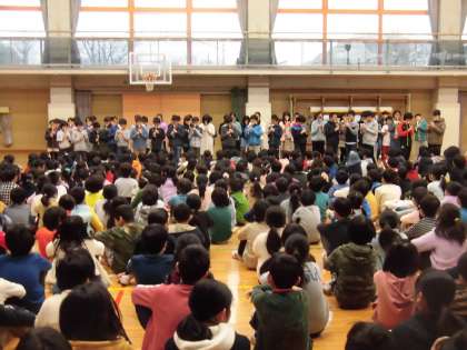 続いて、6年生を送る会でみんなで歌う合唱曲「大切なもの」を練習しました。音楽の時間に練習をしてきた曲を、みんなで合わせる楽しさを味わいました。体育館に素敵な歌声が響き渡りました。