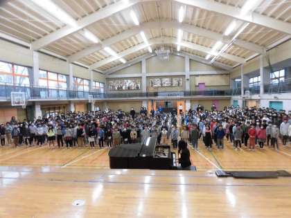 朝の活動の時間、体育館で音楽朝会を行いました。
