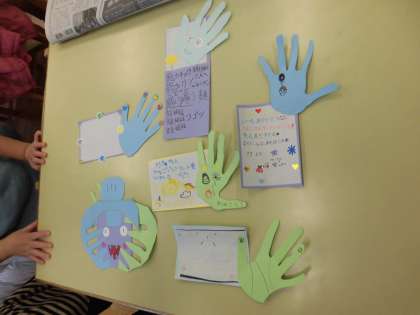 今日の工作は、自分の手形を使ったカード作りです。何を書こうかなやんで、書かずに持ち帰る子、友達へのメッセージを書く子、両面かざり付ける子と様々でしたが、素敵なカードができました。