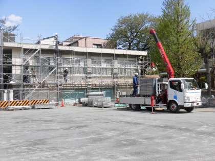 北校舎棟1・2階教室の空調機の配管移設のための工事や中庭での足場設置のための基礎づくり、図書館棟の足場設置作業などが進められています。