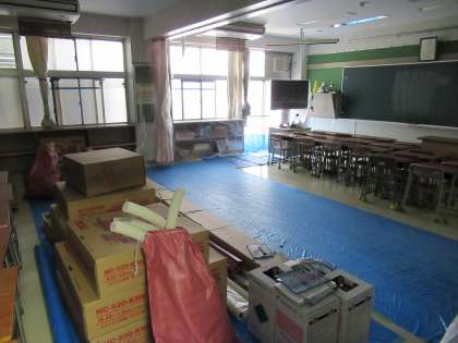 左の写真は、分かりますね。みなさんが1年間過ごす教室です。写真をとったのは、午前中です。工事をしているので真っ暗でいろいろな機材も置いてあります。みなさんが登校した日には、元通りになっている予定です。ピカピカの教室が楽しみですね。