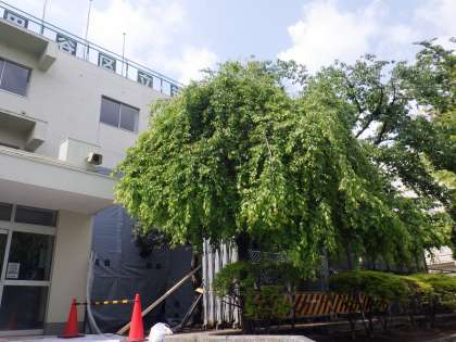笹原小学校のしだれ梅も花はすっかり落ちきって、美しい若葉が繁っています。
