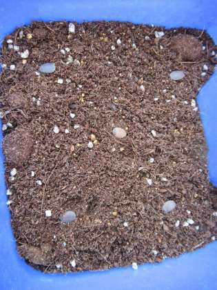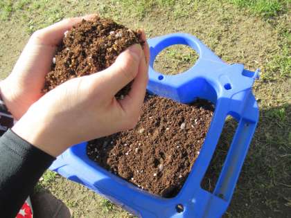 上の写真は、土を入れているところです。種に布団をかぶせられるように土を少し残しておきます。