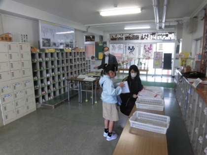 今日の午前中、5月11日(月)に配布した学習の成果物を提出に、3年生の子どもたちや保護者の方が、割り当てられた時間帯に登校しました。