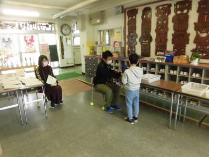 それぞれの担任が、健康や学習の状況を聴いたり、頑張って取り組んだ学習の成果物を提出したりしました。また、2回目の家庭学習のための資料(栽培セットを含めて)を受け取り、次回の登校日を確認し、元気なあいさつをして下校しました。