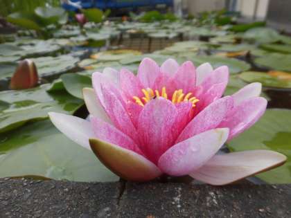 家庭学習の成果を届けに来た5年生の「おはようございます。」と、いう元気なあいさつに先生はうれしい気持ちになりました。そんな気持ちでふと、職員室前のビオトープに目線を移すときれいな蓮の花がさいており、さらにうれしい気持ちになりました。
