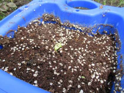 先生たちは、2週間前にみなさんと同じヘチマの種をまきました。そして、ついに今日芽が小さく出ました。左の写真が芽の出た様子です。小さい芽ですが確実に育っています。