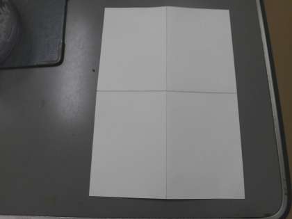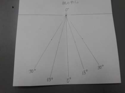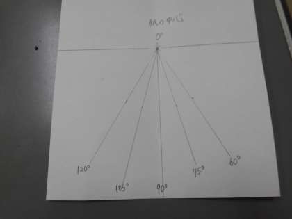 今日は、理科「ふりこの運動」で、ふりこを使った実験の準備をする日でした。むずかしかった人は、せたがやスタディTVやこのページを参考に作ってみてください。まず、紙を4つ折りにして、線を引く。次に、紙の中心に分度器の中心を合わせて、60度、75度、90度、105度、120度に印を付ける。そして、60度と120度は30度に、75度と105度は15度に書きかえる。90度は0度なので書かなくてもよい。これで、角度板が出来上がりです。