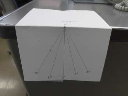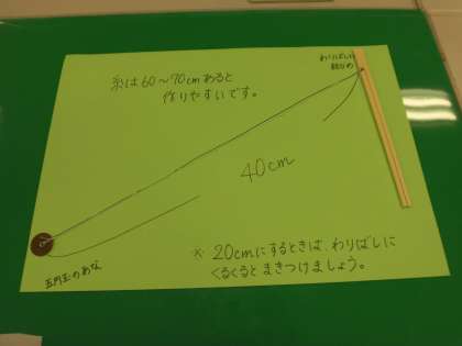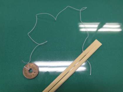 次に、ふりこを作ります。糸を60センチから70センチくらい用意します。長めの方が作りやすいです。5円玉の穴に糸を通して片方を結び、もう片方を割りばしに結びます。ふりこの長さが40センチになるまで、割りばしにくるくると巻いて調節しましょう。いよいよ組み立てです。角度板は机やテーブルにぴったり付けてはりましょう。