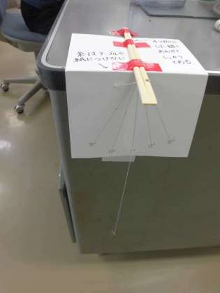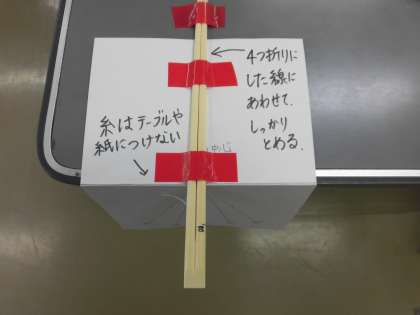 割りばしを4つ折りにした線に合わせて、テープでしっかりとはります。割りばしからたれている糸は、角度板にさわらないように、空中に出しておくと、実験がしやすくなります。これで、実験の準備はできました。時間を計るものを準備して、どんな結果になるのか?実験を楽しんでください。